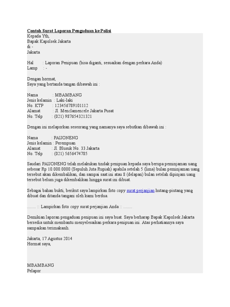 Jika Anda berencana untuk melaporkan seseorang atau. Berikut ini salah satu contoh surat pengaduan ke polisi untuk menambah referensimu.